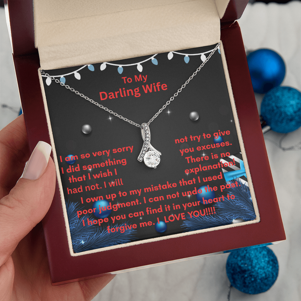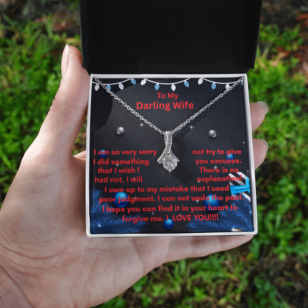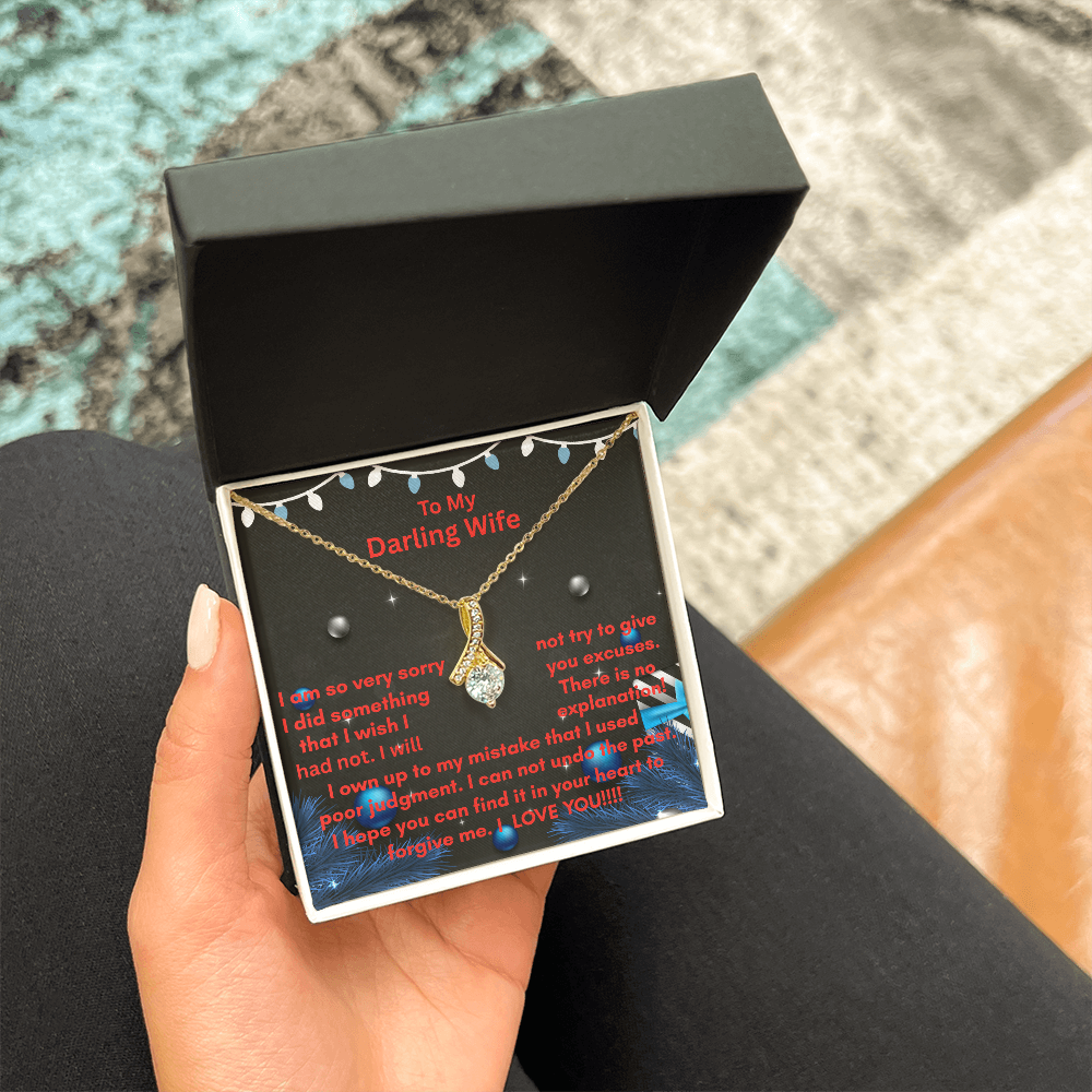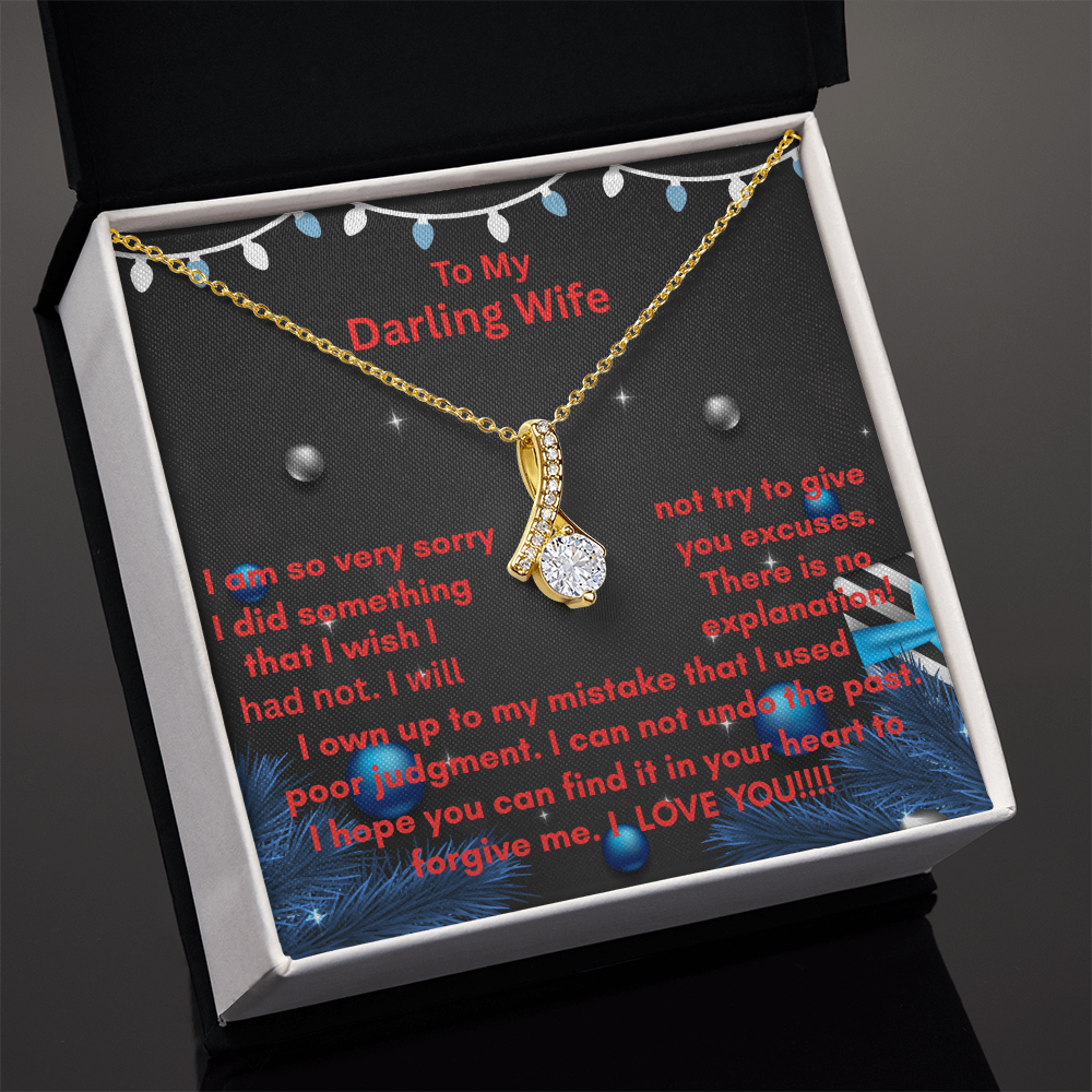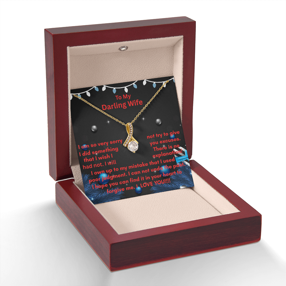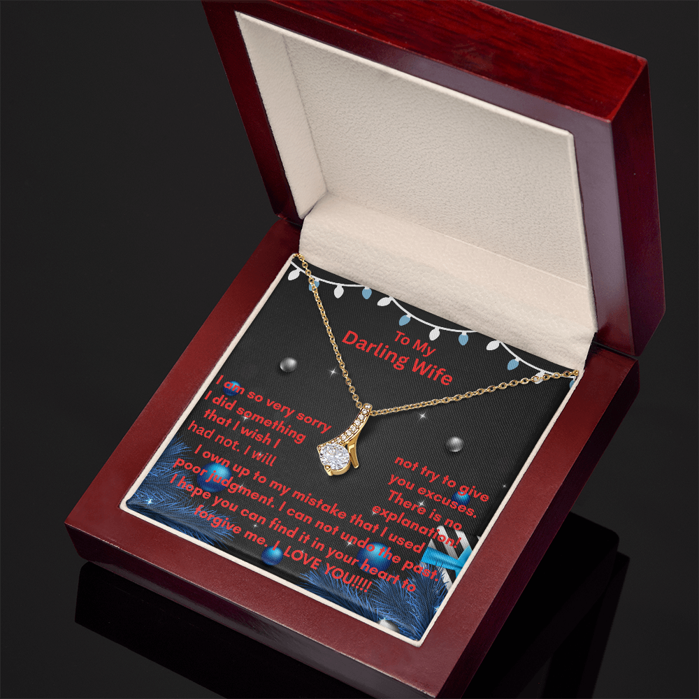 Watch her reaction when she opens this stunning gift! The Alluring Beauty necklace features a petite ribbon-shaped pendant that is sure to dazzle your special someone. Whether it's a birthday, or anniversary, or Christmas, make sure to get her a gift she will love for years to come. It is available in 14K white gold finish or 18K yellow gold finish. The luxury box has a built-in LED light, so when opened, it illuminates the necklace, making it shimmer and sparkle.
