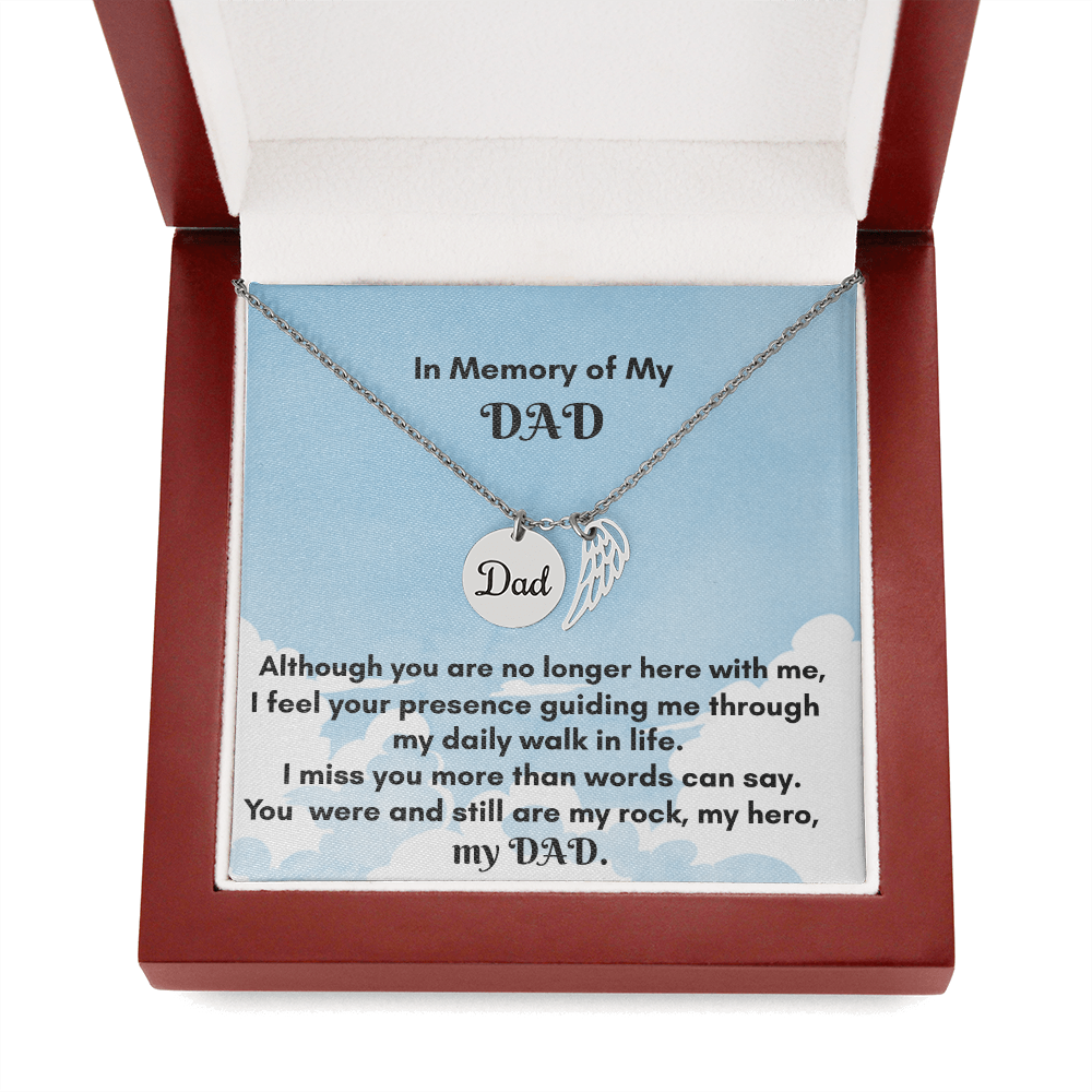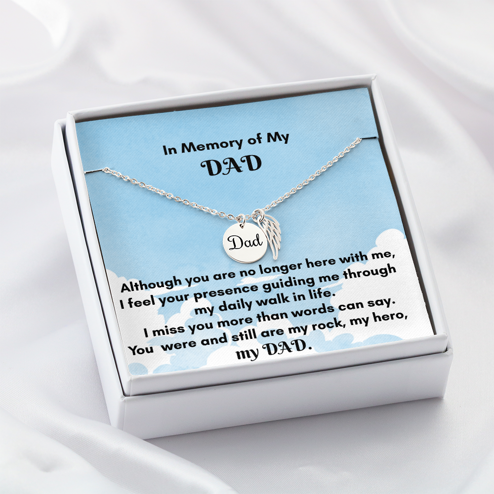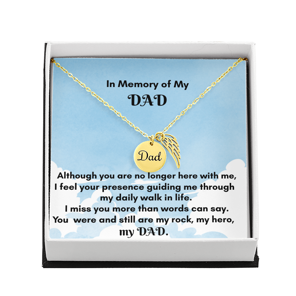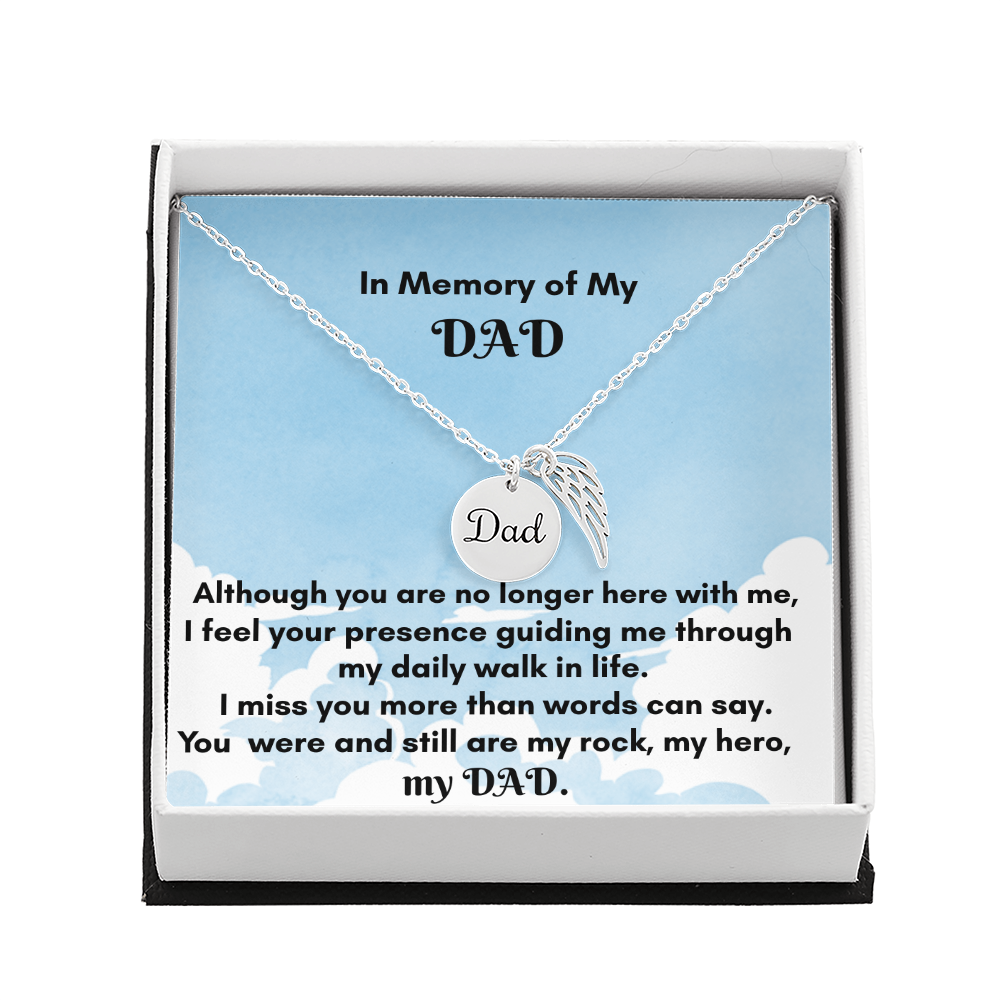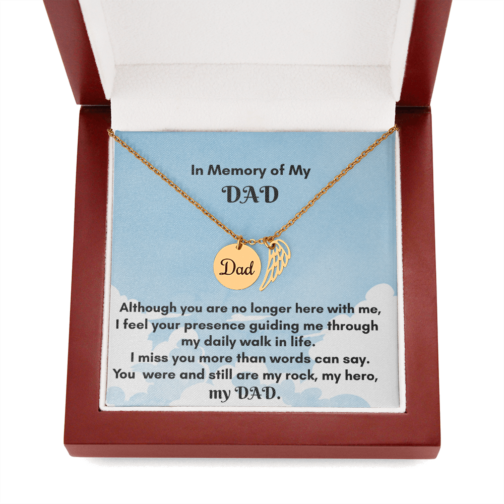 Wear this beautiful necklace and carry your cherished memories of Dad with you always, thanks to our heartfelt Memorial Necklace. The word "Dad" is elegantly engraved on a delicately hand-polished coin, accented with black enamel for a striking contrast. This coin is beautifully paired with a delicate, polished Angel Wing tag, creating a meaningful and stylish accessory that keeps Dad's spirit close to your heart.