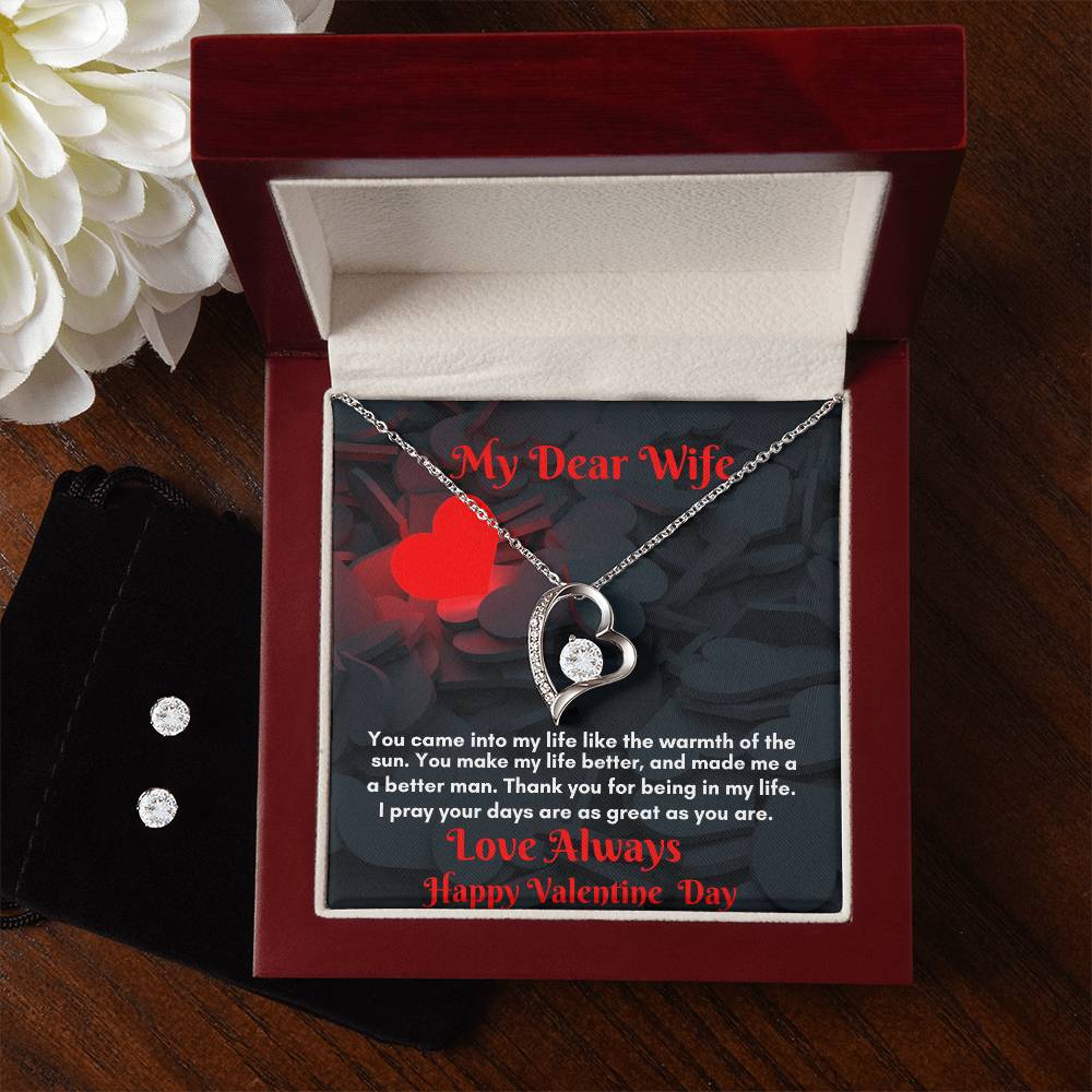 Give you wife this beautiful necklace and earring set for Valentines Day. She will be so excited when you upgrade to the Luxury box, as when she opens the box a LED light will shine and shimmer on the necklace making it shimmer and shine.