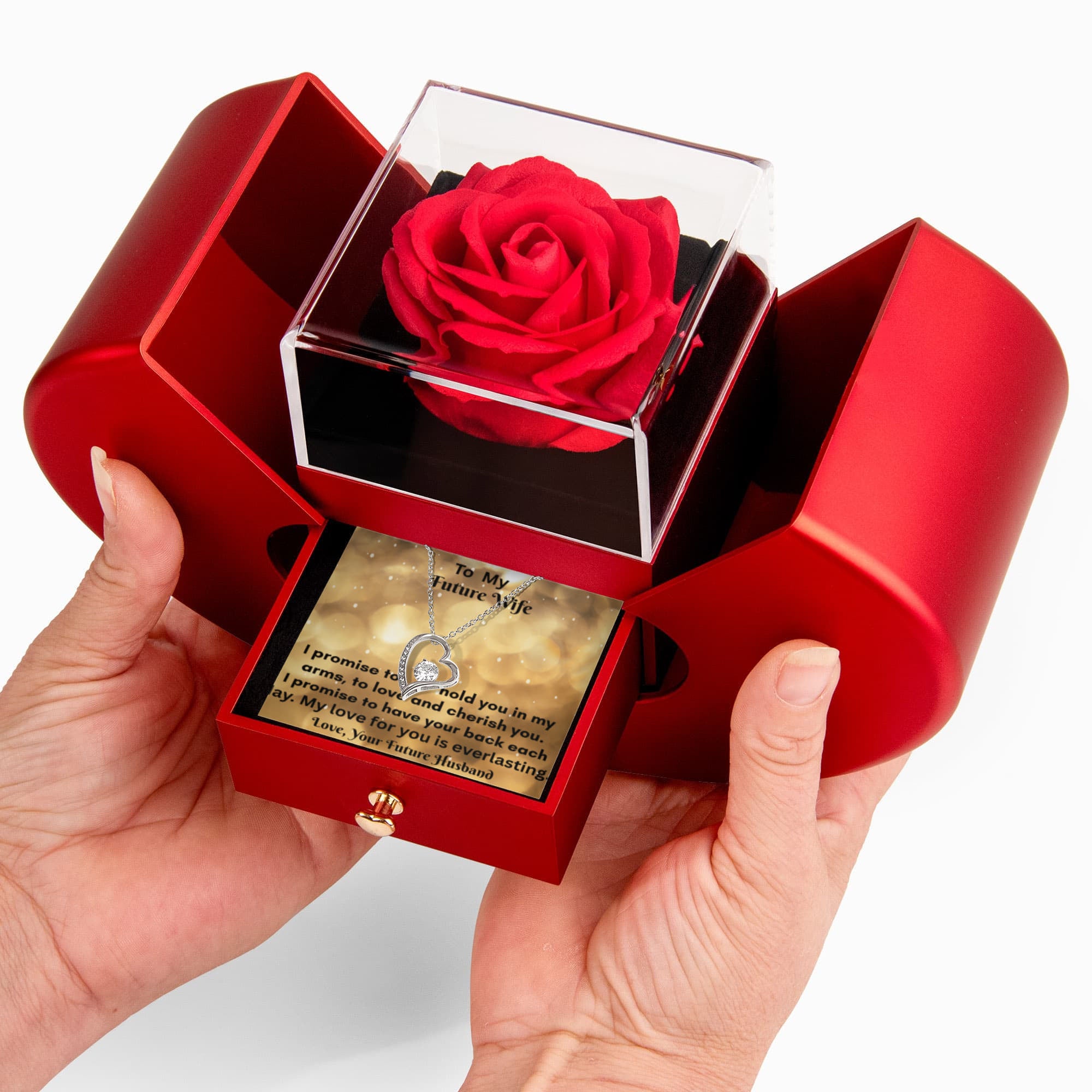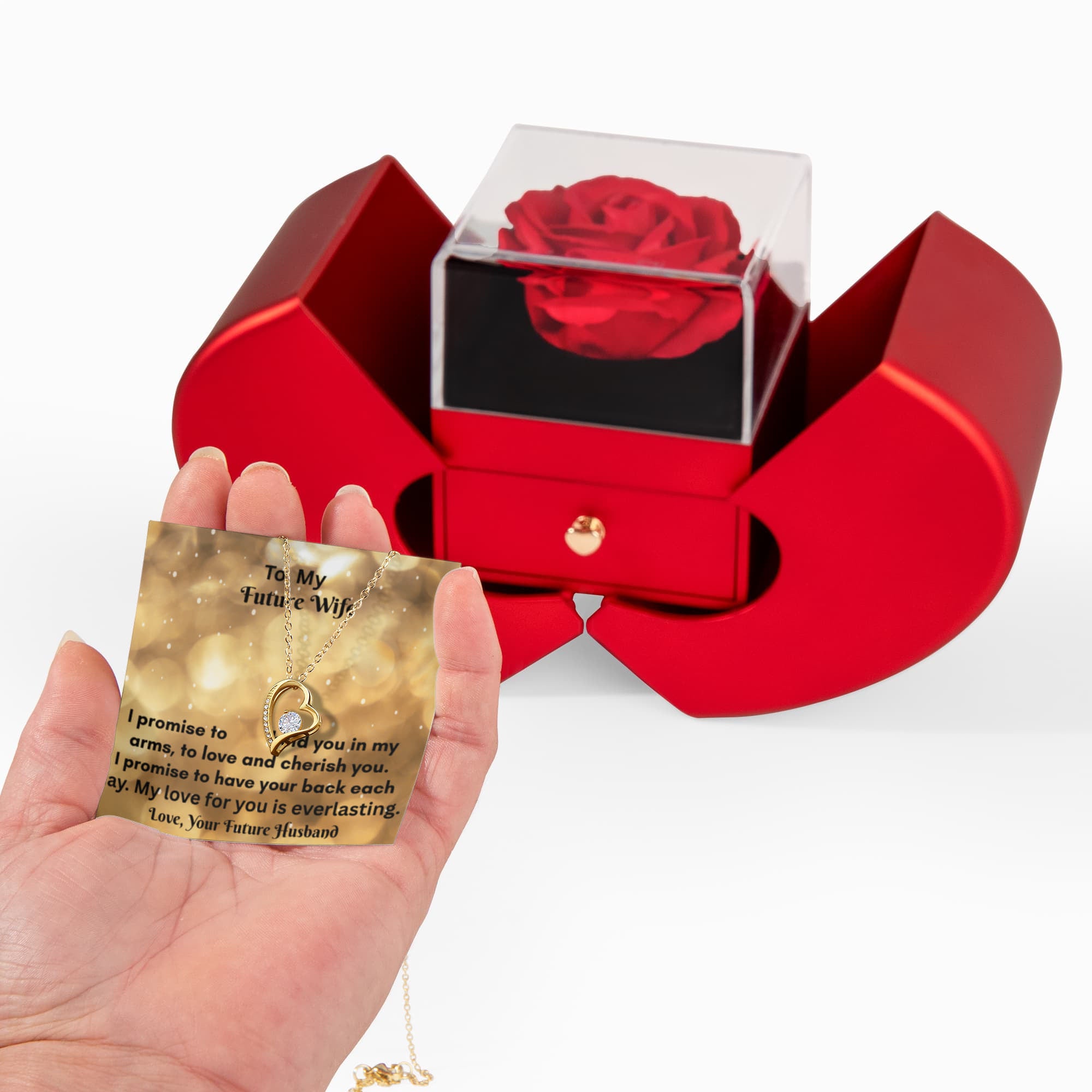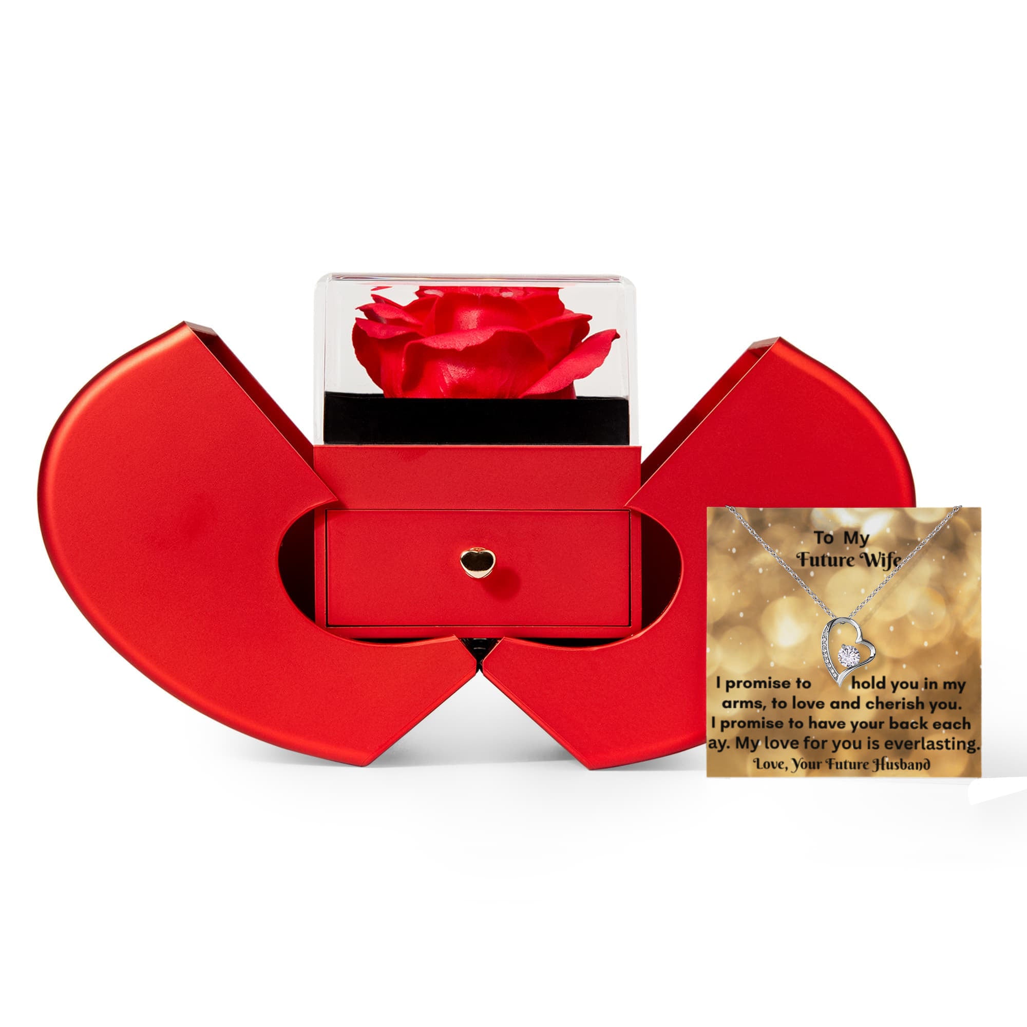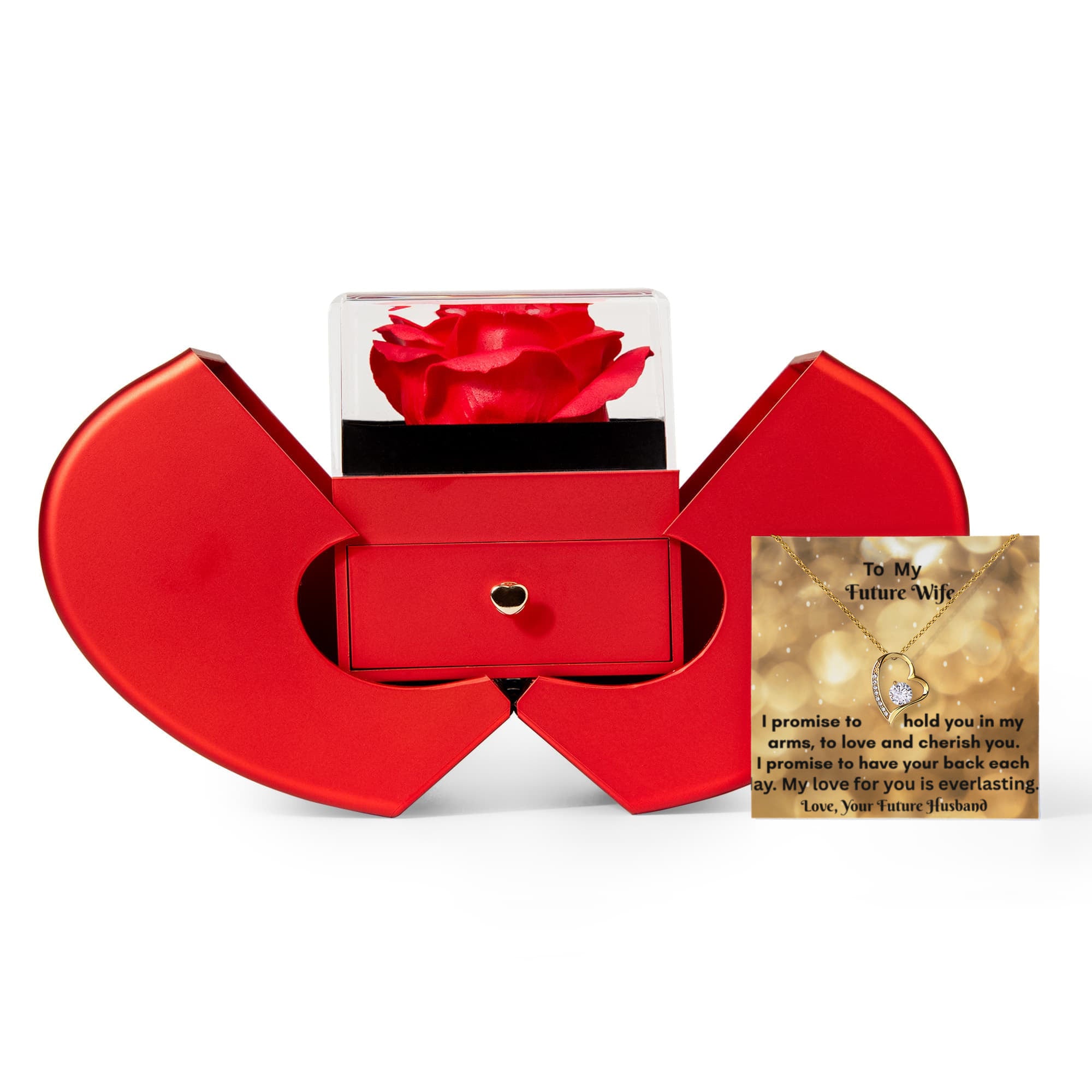 A most beautiful gift to give the bride-to-be, she may even want to wear this on her wedding day. Create an unforgettable gifting experience with our elegant Forever Love Necklace and Heart Box gift set. The everlasting rose symbolizes eternal love, while the sparkling necklace serves as the perfect token of your love. Ideal for birthdays, anniversaries, or any special occasion, this beautiful package is guaranteed to make your loved one feel truly cherished and appreciated. It is available in both 14K white gold over stainless steel or 18K yellow gold over stainless steel.
