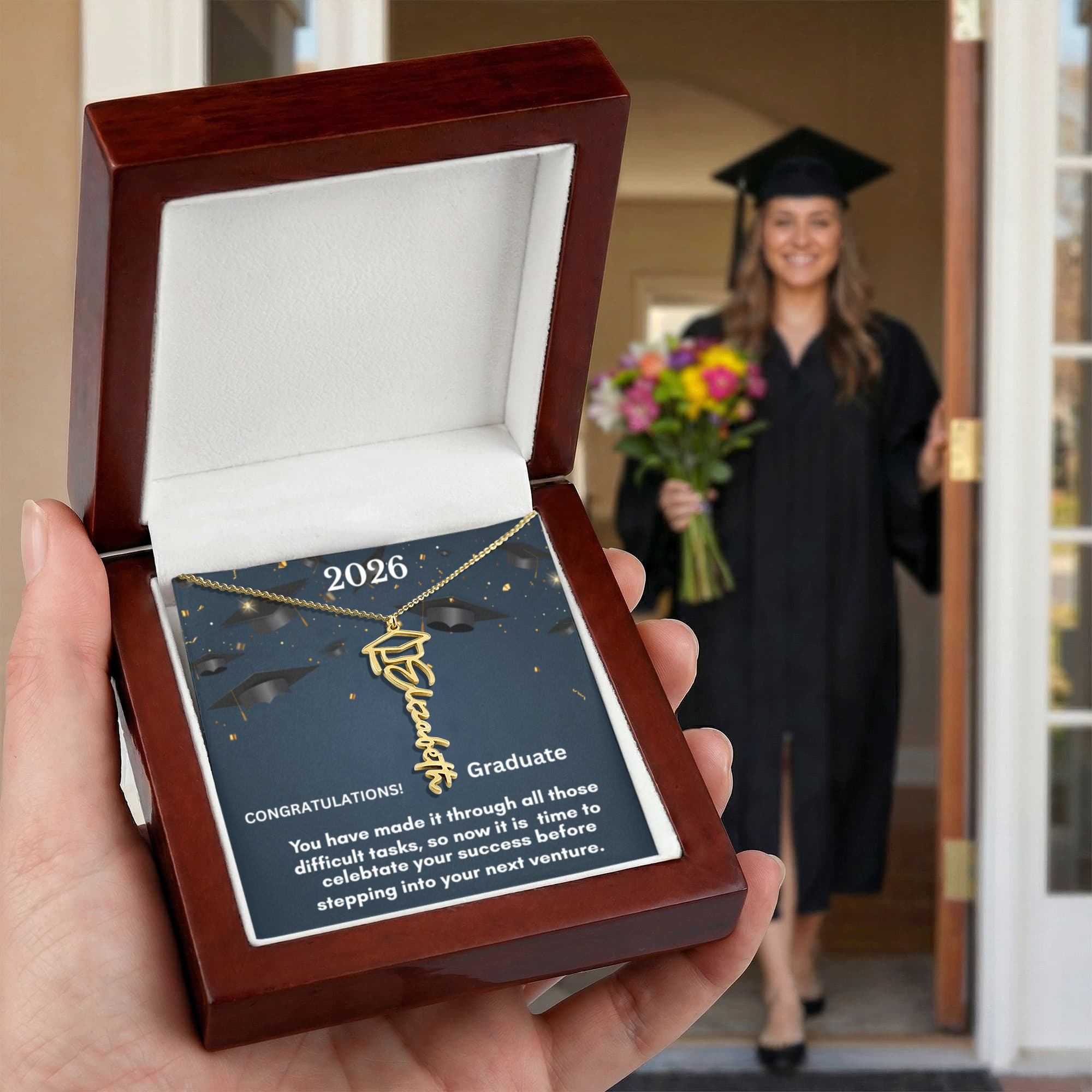 Thoughtfully personalized with the name or word of your choice, this necklace makes an unforgettable graduation gift for high school, college, or beyond. Whether worn on the big day or cherished for years to come, it’s a beautiful reminder of how far they’ve come—and how bright their future is.