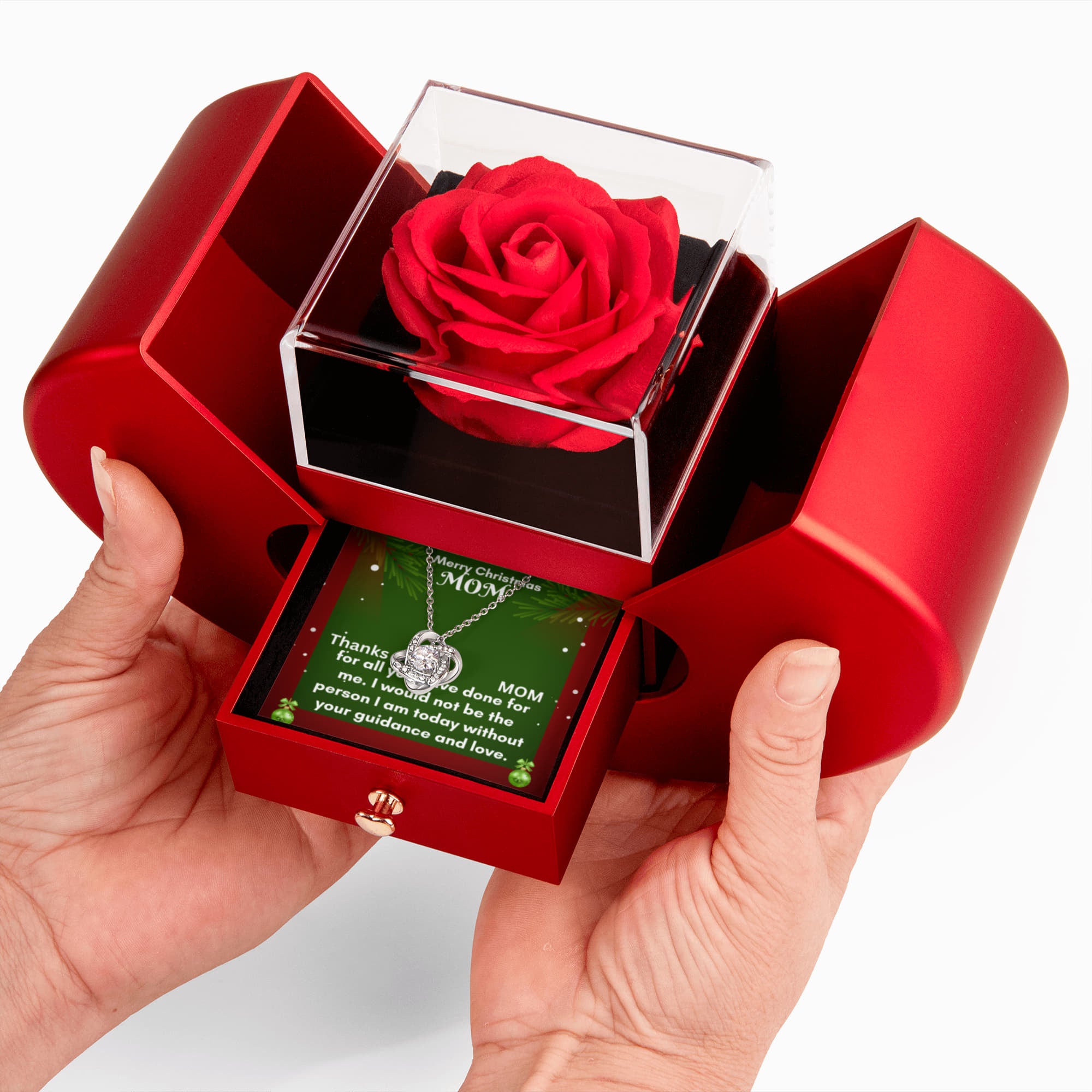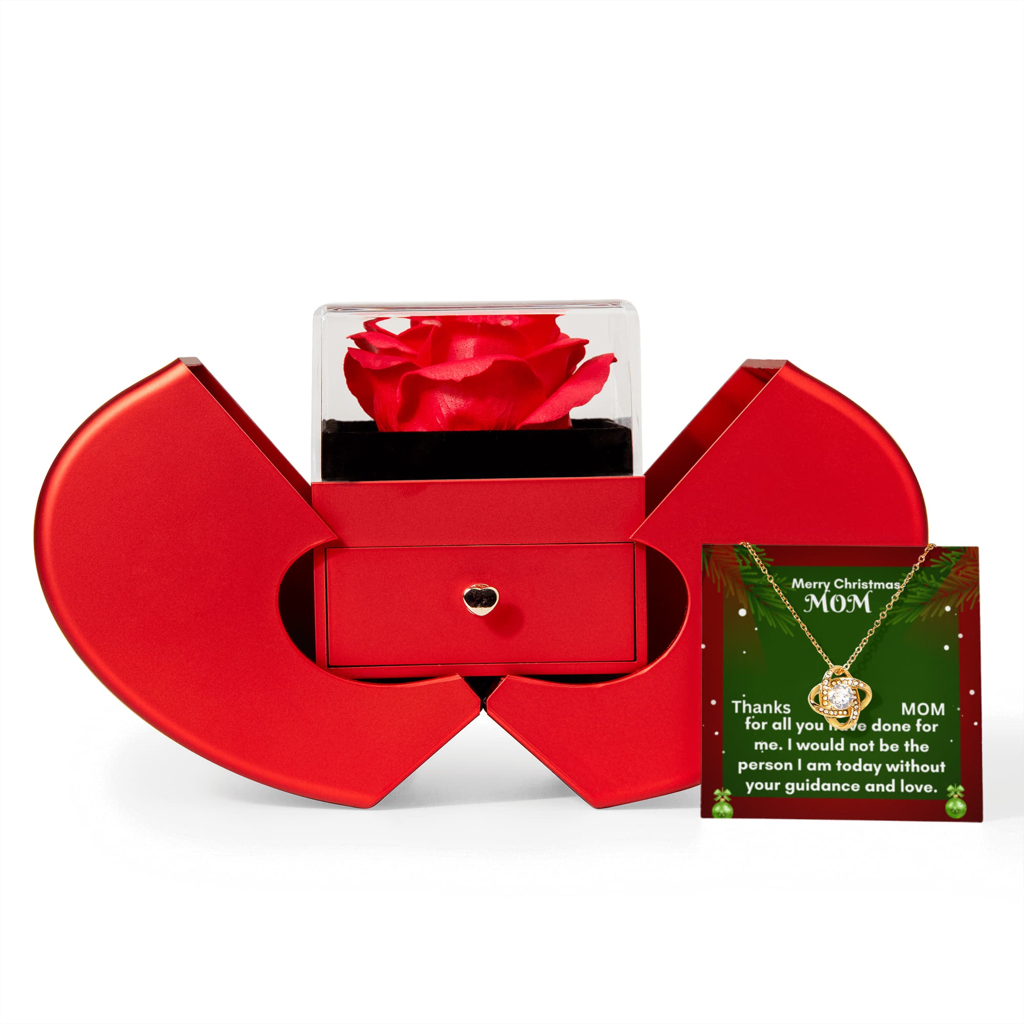 Give your loved one the most beautiful Love knot necklace, encased in a heart-shaped box. When she opens it, a rose will be revealed, along with a drawer containing the necklace. Create an unforgettable gifting experience with our elegant Rose and Love knot Necklace Gift Set, complete with a festive greeting card. The everlasting Rose symbolizes eternal love, while the sparkling Love knot Necklace serves as the perfect token of your love. Ideal for a special occasion, this beautiful package is guaranteed to make your loved one feel truly cherished and appreciated.