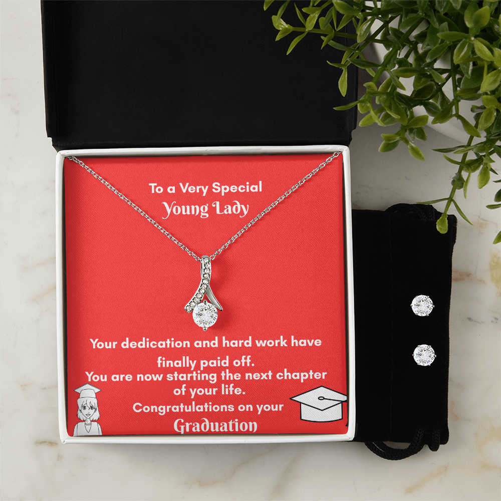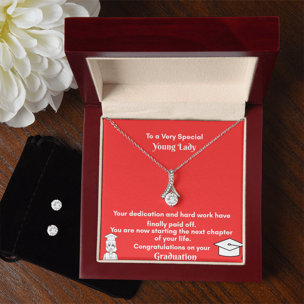 Give your Graduate this beautiful, Alluring Beauty necklace and earring set! She will wear the necklace with pride, knowing that it came from the one who loves her. It is available in a standard or luxury box, which has a built-in LED light that illuminates the necklace when opened, making the necklace shimmer and shine. It also has an adjustable chain so it can be worn with any outfit.